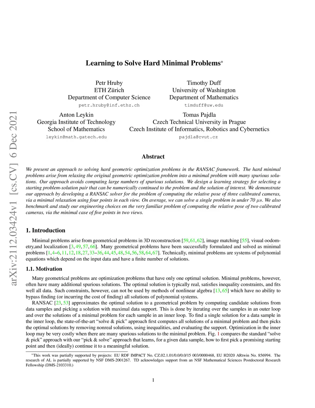 We present an approach to solving hard geometric optimization problems in the RANSAC framework. The hard minimal problems arise from relaxing the original geometric optimization problem into a minimal problem with many spurious solutions. Our approach avoids computing large numbers of spurious solutions. We design a learning strategy for selecting a starting problem-solution pair that can be numerically continued to the problem and the solution of interest. We demonstrate our approach by developing a RANSAC solver for the problem of computing the relative pose of three calibrated cameras, via a minimal relaxation using four points in each view. On average, we can solve a single problem in under 70 We also benchmark and study our engineering choices on the very familiar problem of computing the relative pose of two calibrated cameras, via the minimal case of five points in two views.