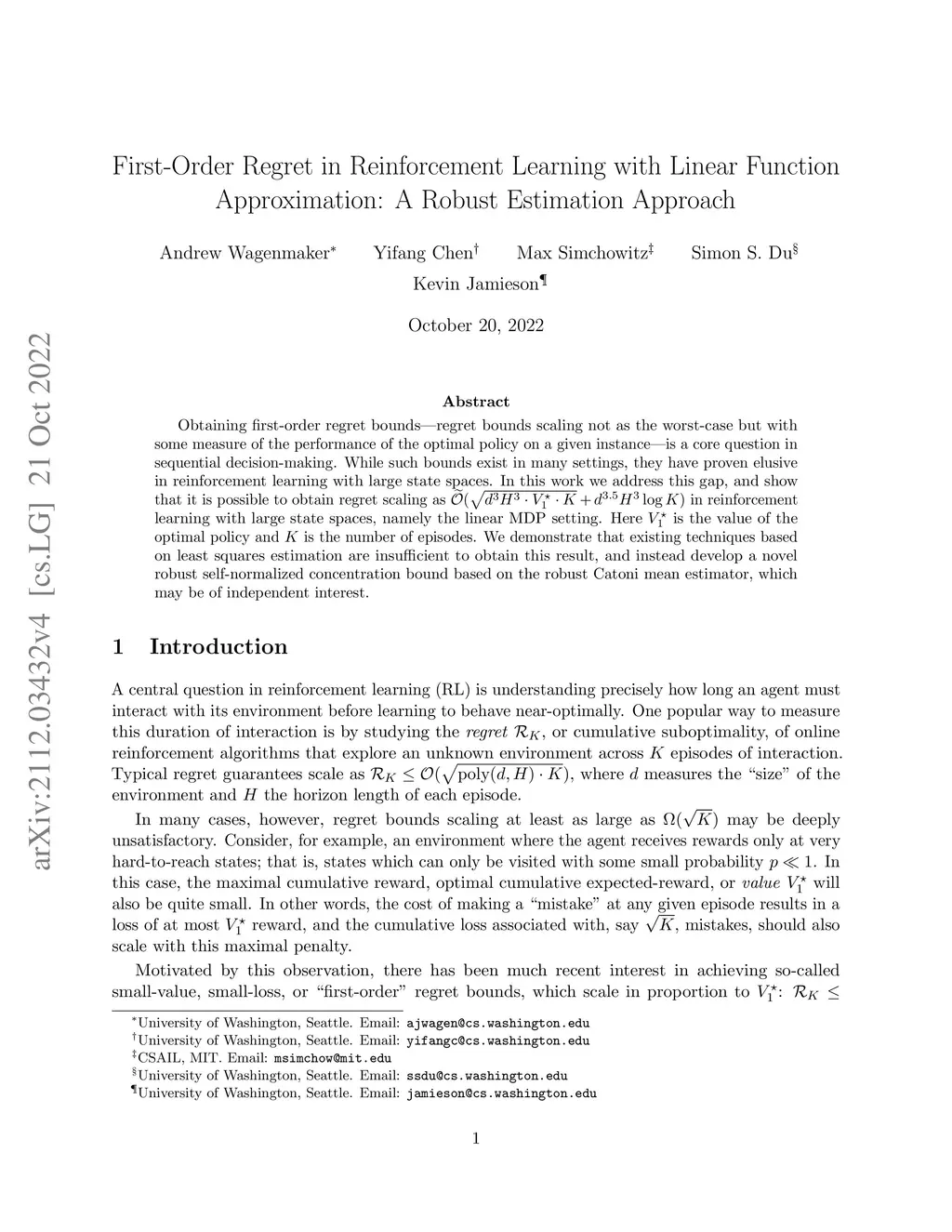 Obtaining first-order regret bounds -- regret bounds scaling not as the worst-case but with some measure of the performance of the optimal policy on a given instance -- is a core question in sequential decision-making. While such bounds exist in many settings, they have proven elusive in reinforcement learning with large state spaces. In this work we address this gap, and show that it is possible to obtain regret scaling as in reinforcement learning with large state spaces, namely the linear MDP setting. Here is the value of the optimal policy and is the number of episodes. We demonstrate that existing techniques based on least squares estimation are insufficient to obtain this result, and instead develop a novel robust self-normalized concentration bound based on the robust Catoni mean estimator, which may be of independent interest.