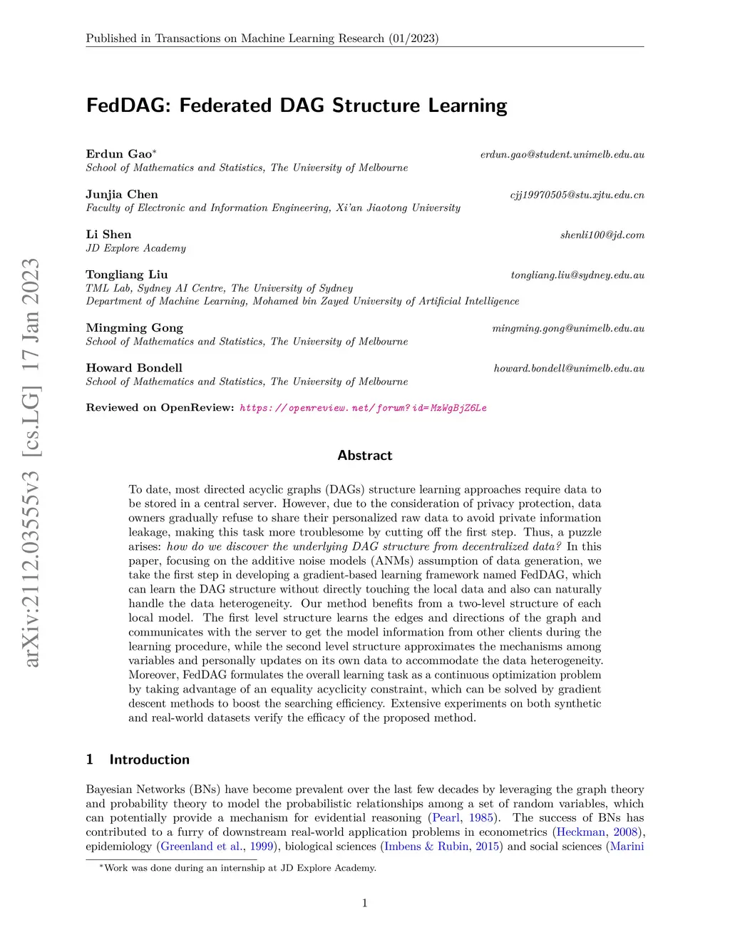 To date, most directed acyclic graphs (DAGs) structure learning approaches require data to be stored in a central server. However, due to the consideration of privacy protection, data owners gradually refuse to share their personalized raw data to avoid private information leakage, making this task more troublesome by cutting off the first step. Thus, a puzzle arises: \textit{how do we discover the underlying DAG structure from decentralized data?} In this paper, focusing on the additive noise models (ANMs) assumption of data generation, we take the first step in developing a gradient-based learning framework named FedDAG, which can learn the DAG structure without directly touching the local data and also can naturally handle the data heterogeneity. Our method benefits from a two-level structure of each local model. The first level structure learns the edges and directions of the graph and communicates with the server to get the model information from other clients during the learning procedure, while the second level structure approximates the mechanisms among variables and personally updates on its own data to accommodate the data heterogeneity. Moreover, FedDAG formulates the overall learning task as a continuous optimization problem by taking advantage of an equality acyclicity constraint, which can be solved by gradient descent methods to boost the searching efficiency. Extensive experiments on both synthetic and real-world datasets verify the efficacy of the proposed method.