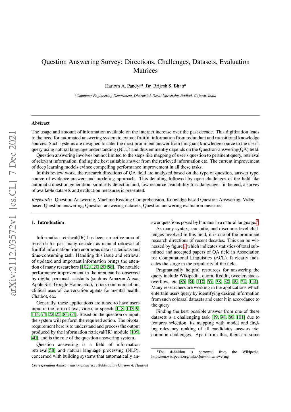 Question Answering Survey: Directions, Challenges, Datasets, Evaluation