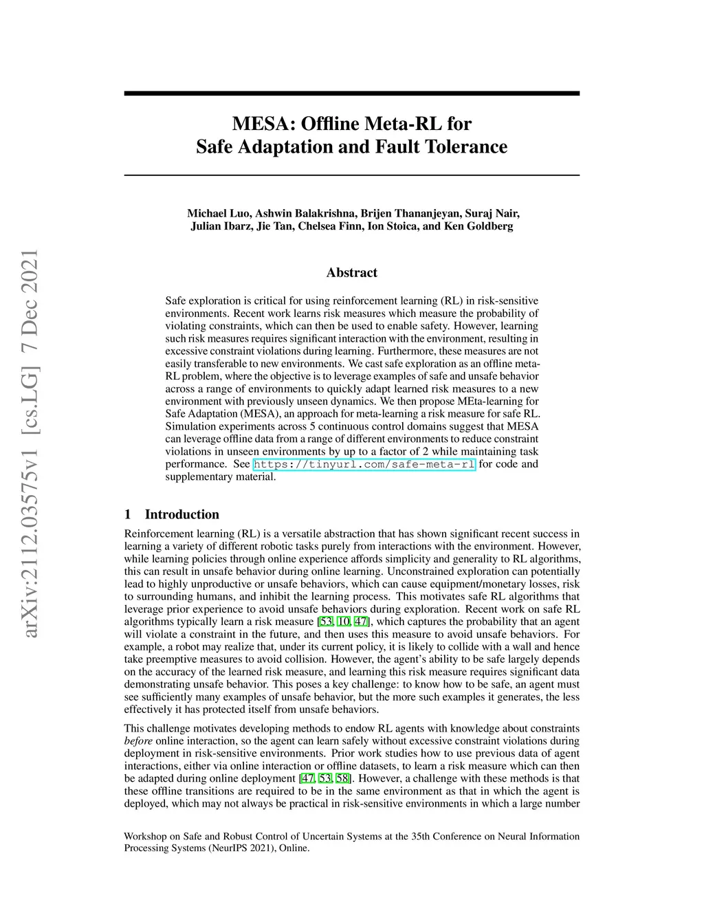 MESA: Offline Meta-RL for Safe Adaptation and Fault Tolerance