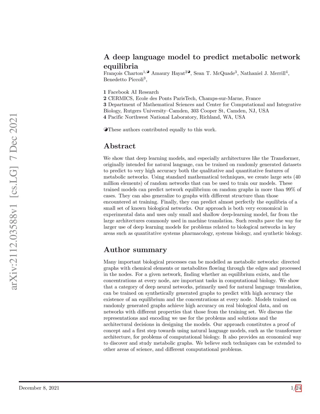 We show that deep learning models, and especially architectures like the Transformer, originally intended for natural language, can be trained on randomly generated datasets to predict to very high accuracy both the qualitative and quantitative features of metabolic networks. Using standard mathematical techniques, we create large sets (40 million elements) of random networks that can be used to train our models. These trained models can predict network equilibrium on random graphs in more than 99% of cases. They can also generalize to graphs with different structure than those encountered at training. Finally, they can predict almost perfectly the equilibria of a small set of known biological networks. Our approach is both very economical in experimental data and uses only small and shallow deep-learning model, far from the large architectures commonly used in machine translation. Such results pave the way for larger use of deep learning models for problems related to biological networks in key areas such as quantitative systems pharmacology, systems biology, and synthetic biology.