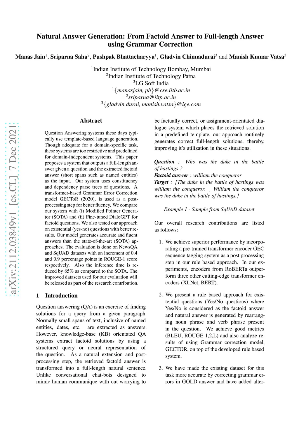 Question Answering systems these days typically use template-based language generation. Though adequate for a domain-specific task, these systems are too restrictive and predefined for domain-independent systems. This paper proposes a system that outputs a full-length answer given a question and the extracted factoid answer (short spans such as named entities) as the input. Our system uses constituency and dependency parse trees of questions. A transformer-based Grammar Error Correction model GECToR (2020), is used as a post-processing step for better fluency. We compare our system with (i) Modified Pointer Generator (SOTA) and (ii) Fine-tuned DialoGPT for factoid questions. We also test our approach on existential (yes-no) questions with better results. Our model generates accurate and fluent answers than the state-of-the-art (SOTA) approaches. The evaluation is done on NewsQA and SqUAD datasets with an increment of 0.4 and 0.9 percentage points in ROUGE-1 score respectively. Also the inference time is reduced by 85\% as compared to the SOTA. The improved datasets used for our evaluation will be released as part of the research contribution.