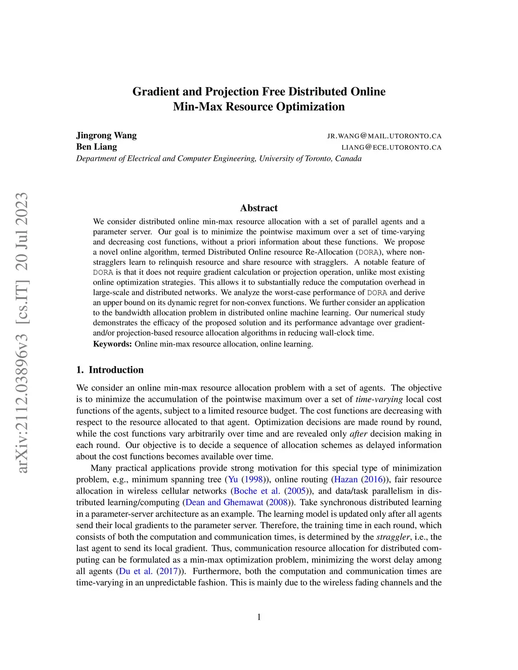 We consider distributed online min-max resource allocation with a set of parallel agents and a parameter server. Our goal is to minimize the pointwise maximum over a set of time-varying and decreasing cost functions, without a priori information about these functions. We propose a novel online algorithm, termed Distributed Online resource Re-Allocation (DORA), where non-stragglers learn to relinquish resource and share resource with stragglers. A notable feature of DORA is that it does not require gradient calculation or projection operation, unlike most existing online optimization strategies. This allows it to substantially reduce the computation overhead in large-scale and distributed networks. We analyze the worst-case performance of DORA and derive an upper bound on its dynamic regret for non-convex functions. We further consider an application to the bandwidth allocation problem in distributed online machine learning. Our numerical study demonstrates the efficacy of the proposed solution and its performance advantage over gradient- and/or projection-based resource allocation algorithms in reducing wall-clock time.