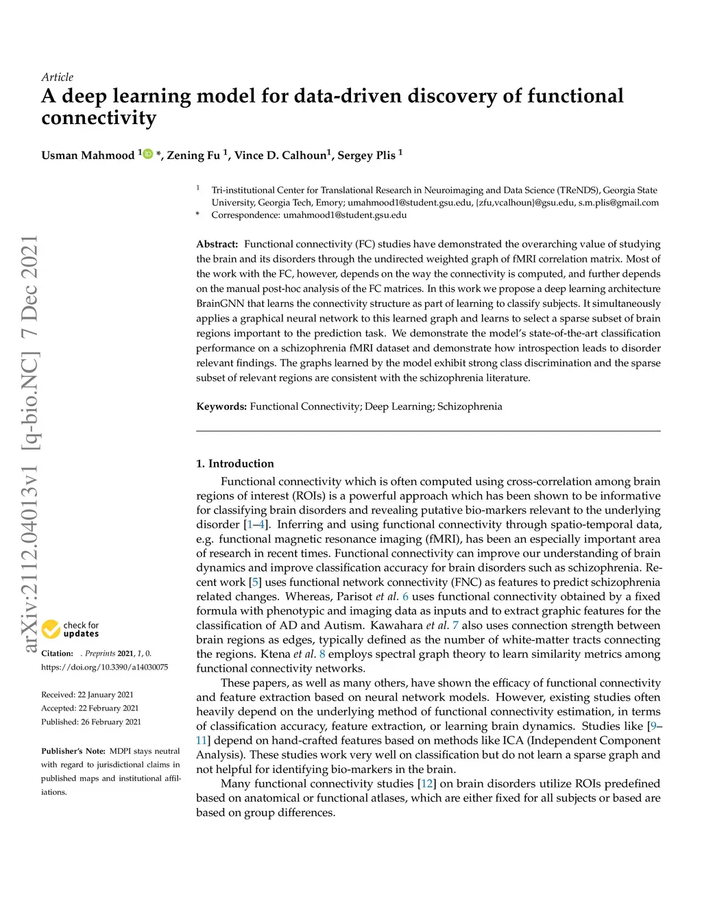 Functional connectivity (FC) studies have demonstrated the overarching value of studying the brain and its disorders through the undirected weighted graph of fMRI correlation matrix. Most of the work with the FC, however, depends on the way the connectivity is computed, and further depends on the manual post-hoc analysis of the FC matrices. In this work we propose a deep learning architecture BrainGNN that learns the connectivity structure as part of learning to classify subjects. It simultaneously applies a graphical neural network to this learned graph and learns to select a sparse subset of brain regions important to the prediction task. We demonstrate the model's state-of-the-art classification performance on a schizophrenia fMRI dataset and demonstrate how introspection leads to disorder relevant findings. The graphs learned by the model exhibit strong class discrimination and the sparse subset of relevant regions are consistent with the schizophrenia literature.