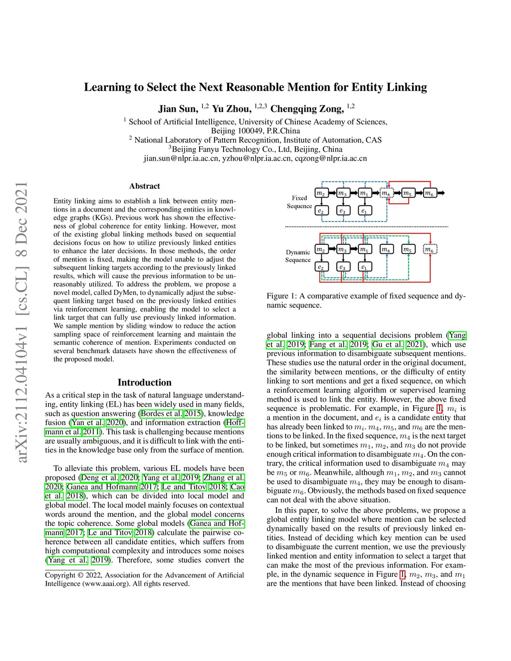 Entity linking aims to establish a link between entity mentions in a document and the corresponding entities in knowledge graphs (KGs). Previous work has shown the effectiveness of global coherence for entity linking. However, most of the existing global linking methods based on sequential decisions focus on how to utilize previously linked entities to enhance the later decisions. In those methods, the order of mention is fixed, making the model unable to adjust the subsequent linking targets according to the previously linked results, which will cause the previous information to be unreasonably utilized. To address the problem, we propose a novel model, called DyMen, to dynamically adjust the subsequent linking target based on the previously linked entities via reinforcement learning, enabling the model to select a link target that can fully use previously linked information. We sample mention by sliding window to reduce the action sampling space of reinforcement learning and maintain the semantic coherence of mention. Experiments conducted on several benchmark datasets have shown the effectiveness of the proposed model.