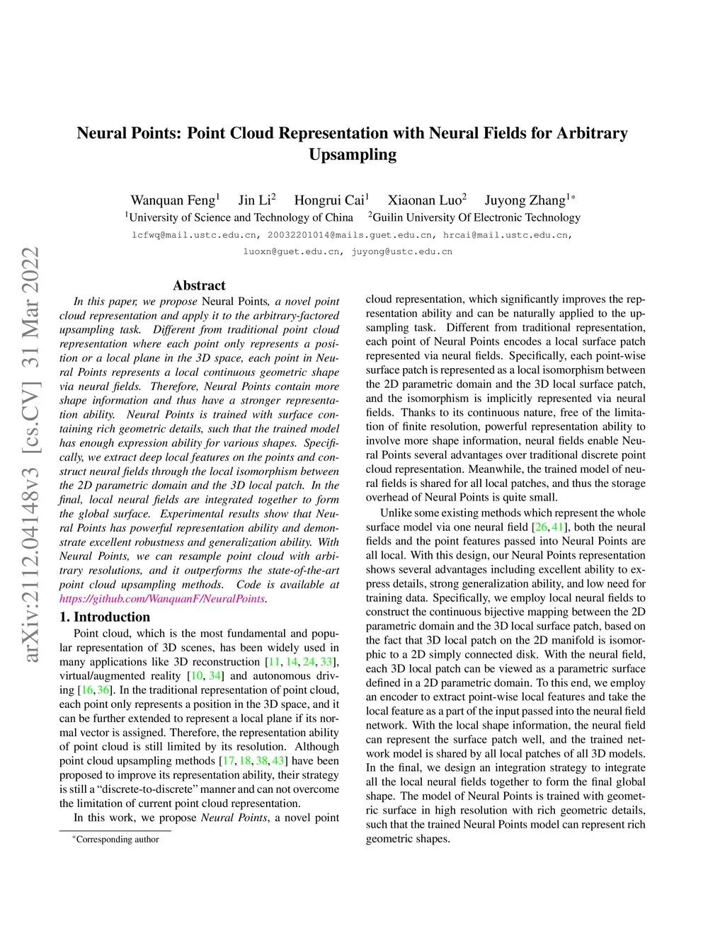 In this paper, we propose Neural Points, a novel point cloud representation and apply it to the arbitrary-factored upsampling task. Different from traditional point cloud representation where each point only represents a position or a local plane in the 3D space, each point in Neural Points represents a local continuous geometric shape via neural fields. Therefore, Neural Points contain more shape information and thus have a stronger representation ability. Neural Points is trained with surface containing rich geometric details, such that the trained model has enough expression ability for various shapes. Specifically, we extract deep local features on the points and construct neural fields through the local isomorphism between the 2D parametric domain and the 3D local patch. In the final, local neural fields are integrated together to form the global surface. Experimental results show that Neural Points has powerful representation ability and demonstrate excellent robustness and generalization ability. With Neural Points, we can resample point cloud with arbitrary resolutions, and it outperforms the state-of-the-art point cloud upsampling methods. Code is available at https://github.com/WanquanF/NeuralPoints.