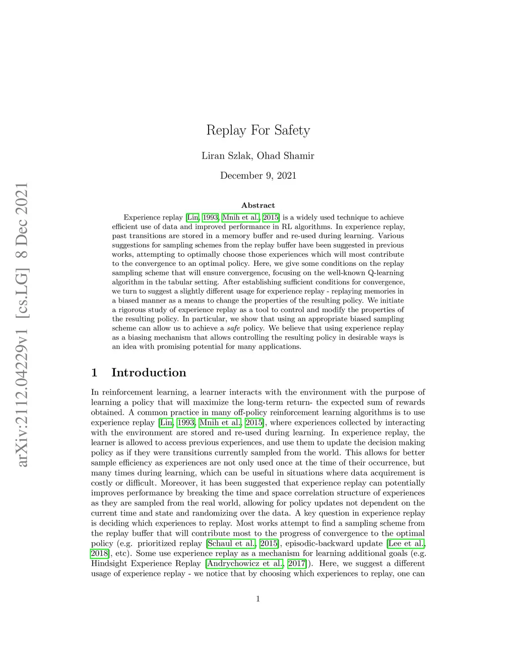 Experience replay \citep{lin1993reinforcement, mnih2015human} is a widely used technique to achieve efficient use of data and improved performance in RL algorithms. In experience replay, past transitions are stored in a memory buffer and re-used during learning. Various suggestions for sampling schemes from the replay buffer have been suggested in previous works, attempting to optimally choose those experiences which will most contribute to the convergence to an optimal policy. Here, we give some conditions on the replay sampling scheme that will ensure convergence, focusing on the well-known Q-learning algorithm in the tabular setting. After establishing sufficient conditions for convergence, we turn to suggest a slightly different usage for experience replay - replaying memories in a biased manner as a means to change the properties of the resulting policy. We initiate a rigorous study of experience replay as a tool to control and modify the properties of the resulting policy. In particular, we show that using an appropriate biased sampling scheme can allow us to achieve a \emph{safe} policy. We believe that using experience replay as a biasing mechanism that allows controlling the resulting policy in desirable ways is an idea with promising potential for many applications.