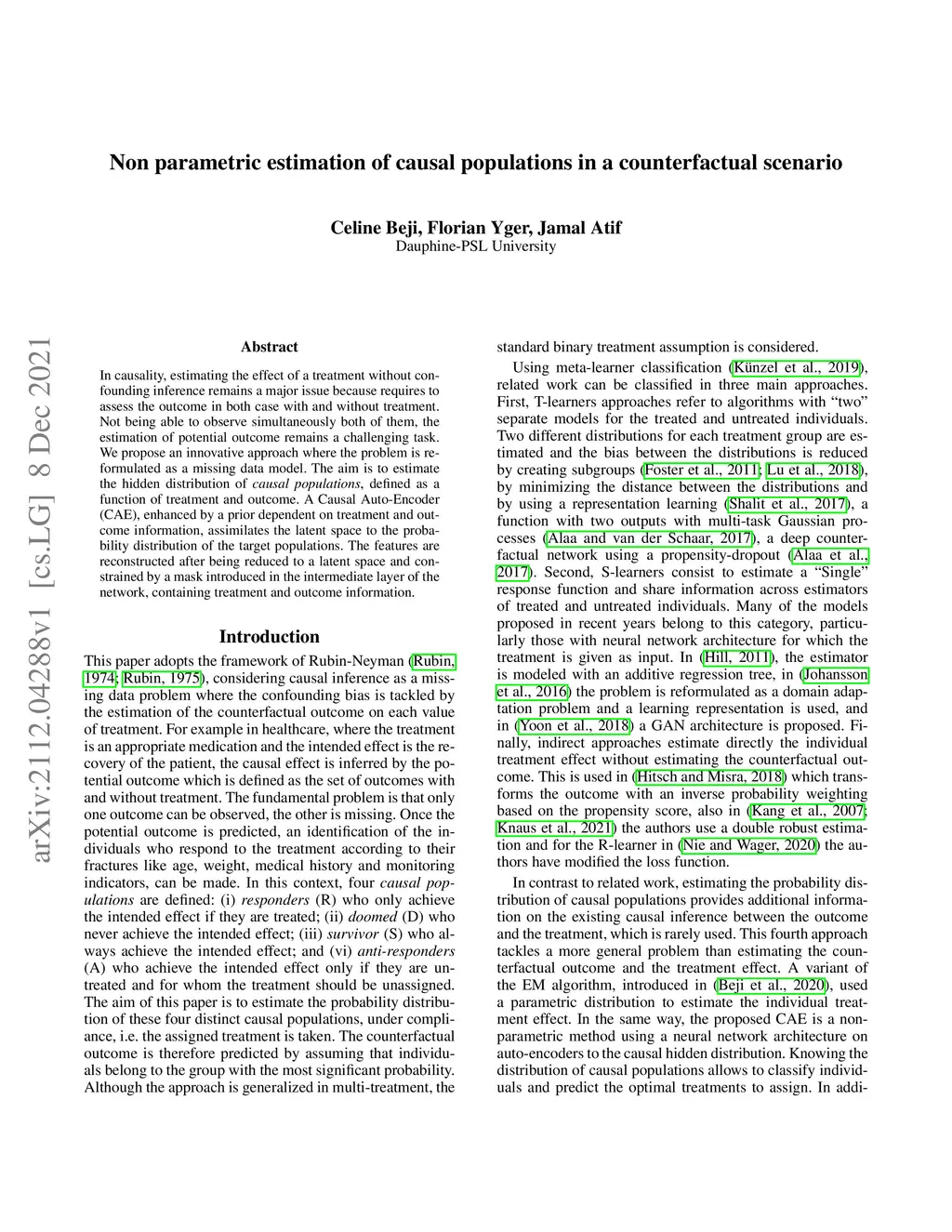 In causality, estimating the effect of a treatment without confounding inference remains a major issue because requires to assess the outcome in both case with and without treatment. Not being able to observe simultaneously both of them, the estimation of potential outcome remains a challenging task. We propose an innovative approach where the problem is reformulated as a missing data model. The aim is to estimate the hidden distribution of \emph{causal populations}, defined as a function of treatment and outcome. A Causal Auto-Encoder (CAE), enhanced by a prior dependent on treatment and outcome information, assimilates the latent space to the probability distribution of the target populations. The features are reconstructed after being reduced to a latent space and constrained by a mask introduced in the intermediate layer of the network, containing treatment and outcome information.