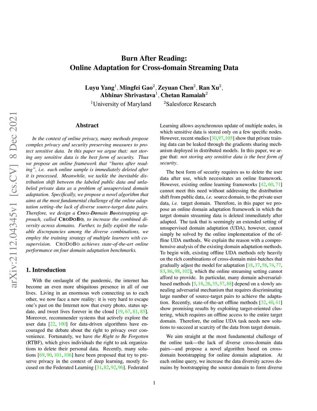 In the context of online privacy, many methods propose complex privacy and security preserving measures to protect sensitive data. In this paper, we argue that: not storing any sensitive data is the best form of security. Thus we propose an online framework that "burns after reading", i.e. each online sample is immediately deleted after it is processed. Meanwhile, we tackle the inevitable distribution shift between the labeled public data and unlabeled private data as a problem of unsupervised domain adaptation. Specifically, we propose a novel algorithm that aims at the most fundamental challenge of the online adaptation setting--the lack of diverse source-target data pairs. Therefore, we design a Cross-Domain Bootstrapping approach, called CroDoBo, to increase the combined diversity across domains. Further, to fully exploit the valuable discrepancies among the diverse combinations, we employ the training strategy of multiple learners with co-supervision. CroDoBo achieves state-of-the-art online performance on four domain adaptation benchmarks.