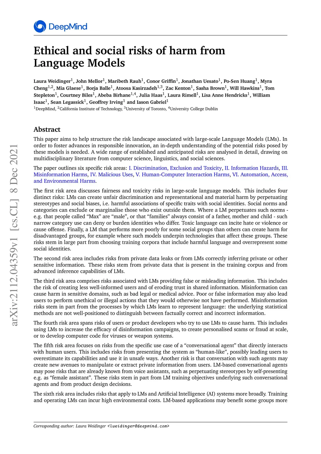 Ethical and social risks of harm from Language Models
