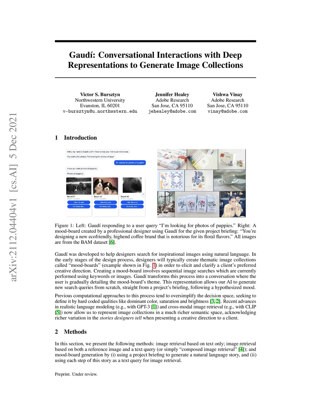 Based on recent advances in realistic language modeling (GPT-3) and cross-modal representations (CLIP), Gaud\í was developed to help designers search for inspirational images using natural language. In the early stages of the design process, with the goal of eliciting a client's preferred creative direction, designers will typically create thematic collections of inspirational images called "mood-boards". Creating a mood-board involves sequential image searches which are currently performed using keywords or images. Gaud\í transforms this process into a conversation where the user is gradually detailing the mood-board's theme. This representation allows our AI to generate new search queries from scratch, straight from a project briefing, following a theme hypothesized by GPT-3. Compared to previous computational approaches to mood-board creation, to the best of our knowledge, ours is the first attempt to represent mood-boards as the stories that designers tell when presenting a creative direction to a client.