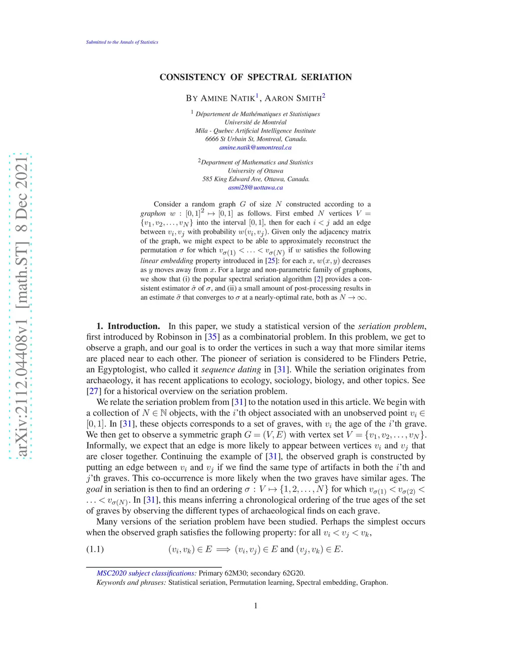 Consider a random graph of size constructed according to a \textit{graphon} as follows. First embed vertices into the interval , then for each add an edge between with probability . Given only the adjacency matrix of the graph, we might expect to be able to approximately reconstruct the permutation for which if satisfies the following \textit{linear embedding} property introduced in [Janssen 2019]: for each , decreases as moves away from . For a large and non-parametric family of graphons, we show that (i) the popular spectral seriation algorithm [Atkins 1998] provides a consistent estimator of , and (ii) a small amount of post-processing results in an estimate that converges to at a nearly-optimal rate, both as .