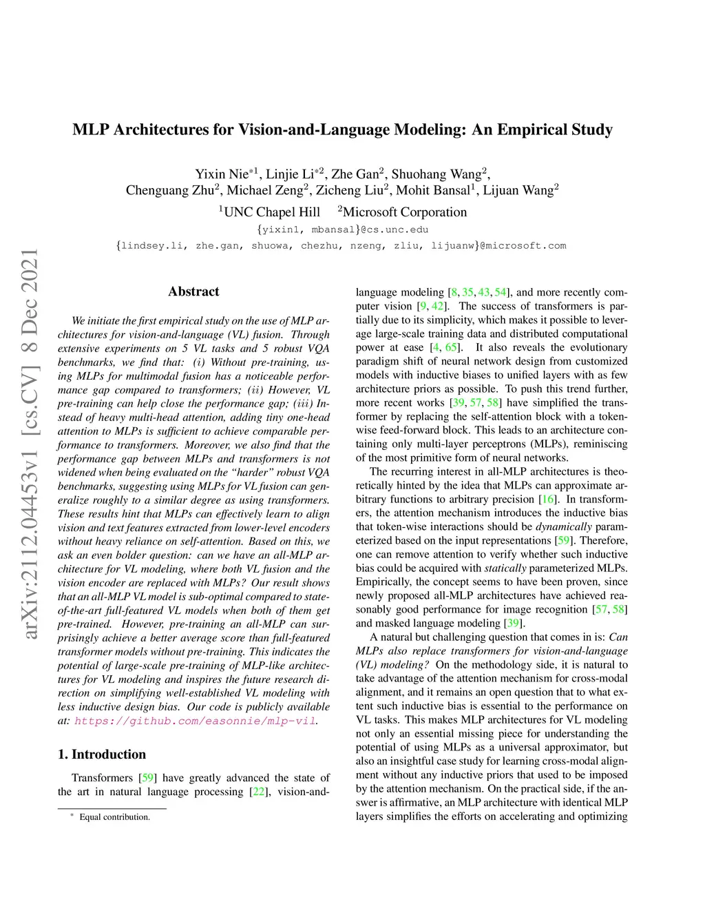 We initiate the first empirical study on the use of MLP architectures for vision-and-language (VL) fusion. Through extensive experiments on 5 VL tasks and 5 robust VQA benchmarks, we find that: (i) Without pre-training, using MLPs for multimodal fusion has a noticeable performance gap compared to transformers; (ii) However, VL pre-training can help close the performance gap; (iii) Instead of heavy multi-head attention, adding tiny one-head attention to MLPs is sufficient to achieve comparable performance to transformers. Moreover, we also find that the performance gap between MLPs and transformers is not widened when being evaluated on the harder robust VQA benchmarks, suggesting using MLPs for VL fusion can generalize roughly to a similar degree as using transformers. These results hint that MLPs can effectively learn to align vision and text features extracted from lower-level encoders without heavy reliance on self-attention. Based on this, we ask an even bolder question: can we have an all-MLP architecture for VL modeling, where both VL fusion and the vision encoder are replaced with MLPs? Our result shows that an all-MLP VL model is sub-optimal compared to state-of-the-art full-featured VL models when both of them get pre-trained. However, pre-training an all-MLP can surprisingly achieve a better average score than full-featured transformer models without pre-training. This indicates the potential of large-scale pre-training of MLP-like architectures for VL modeling and inspires the future research direction on simplifying well-established VL modeling with less inductive design bias. Our code is publicly available at: https://github.com/easonnie/mlp-vil