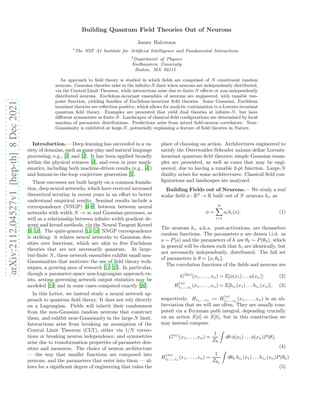 An approach to field theory is studied in which fields are comprised of constituent random neurons. Gaussian theories arise in the infinite- limit when neurons are independently distributed, via the Central Limit Theorem, while interactions arise due to finite- effects or non-independently distributed neurons. Euclidean-invariant ensembles of neurons are engineered, with tunable two-point function, yielding families of Euclidean-invariant field theories. Some Gaussian, Euclidean invariant theories are reflection positive, which allows for analytic continuation to a Lorentz-invariant quantum field theory. Examples are presented that yield dual theories at infinite-, but have different symmetries at finite-. Landscapes of classical field configurations are determined by local maxima of parameter distributions. Predictions arise from mixed field-neuron correlators. Near-Gaussianity is exhibited at large-, potentially explaining a feature of field theories in Nature.