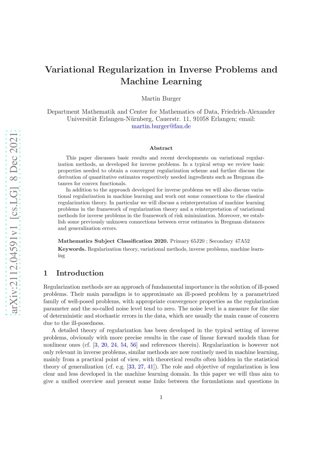 This paper discusses basic results and recent developments on variational regularization methods, as developed for inverse problems. In a typical setup we review basic properties needed to obtain a convergent regularization scheme and further discuss the derivation of quantitative estimates respectively needed ingredients such as Bregman distances for convex functionals. In addition to the approach developed for inverse problems we will also discuss variational regularization in machine learning and work out some connections to the classical regularization theory. In particular we will discuss a reinterpretation of machine learning problems in the framework of regularization theory and a reinterpretation of variational methods for inverse problems in the framework of risk minimization. Moreover, we establish some previously unknown connections between error estimates in Bregman distances and generalization errors.