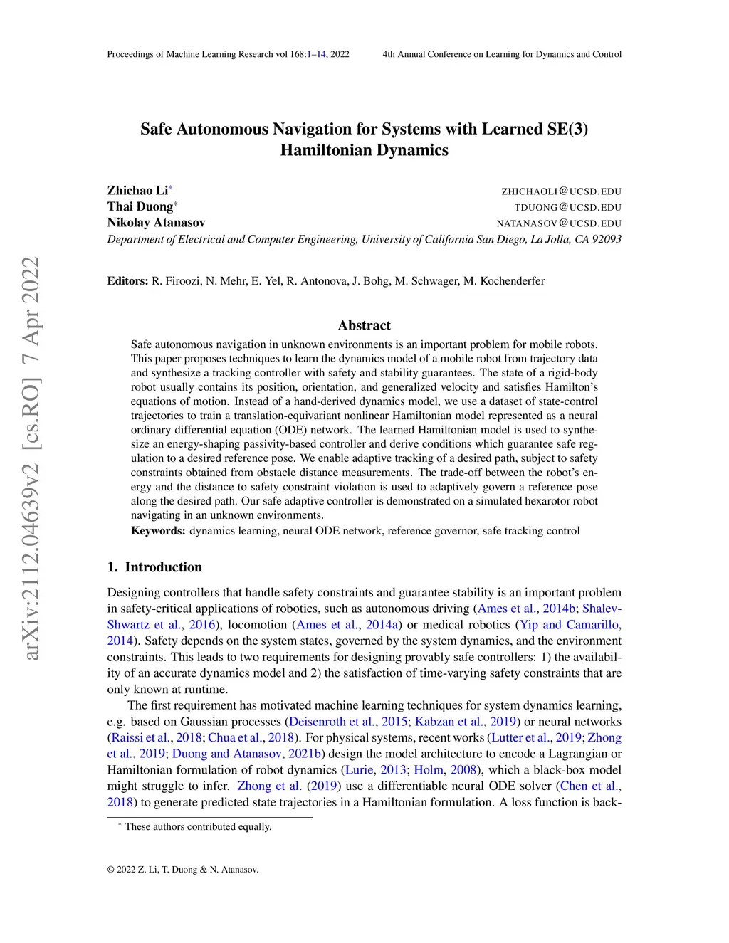 Safe autonomous navigation in unknown environments is an important problem for mobile robots. This paper proposes techniques to learn the dynamics model of a mobile robot from trajectory data and synthesize a tracking controller with safety and stability guarantees. The state of a rigid-body robot usually contains its position, orientation, and generalized velocity and satisfies Hamilton's equations of motion. Instead of a hand-derived dynamics model, we use a dataset of state-control trajectories to train a translation-equivariant nonlinear Hamiltonian model represented as a neural ordinary differential equation (ODE) network. The learned Hamiltonian model is used to synthesize an energy-shaping passivity-based controller and derive conditions which guarantee safe regulation to a desired reference pose. We enable adaptive tracking of a desired path, subject to safety constraints obtained from obstacle distance measurements. The trade-off between the robot's energy and the distance to safety constraint violation is used to adaptively govern a reference pose along the desired path. Our safe adaptive controller is demonstrated on a simulated hexarotor robot navigating in an unknown environments.