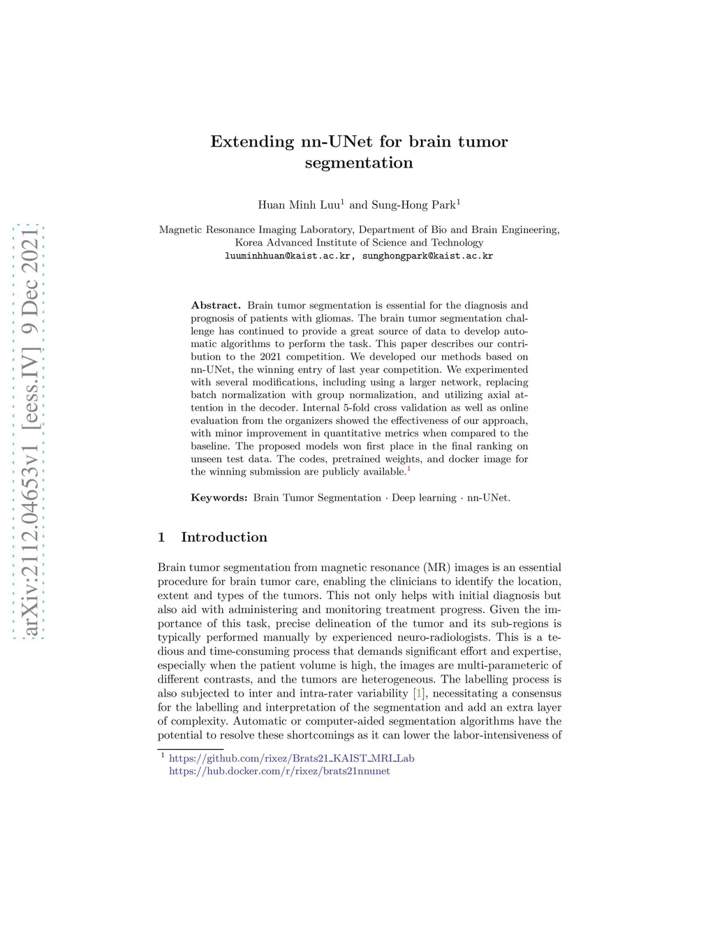 Brain tumor segmentation is essential for the diagnosis and prognosis of patients with gliomas. The brain tumor segmentation challenge has continued to provide a great source of data to develop automatic algorithms to perform the task. This paper describes our contribution to the 2021 competition. We developed our methods based on nn-UNet, the winning entry of last year competition. We experimented with several modifications, including using a larger network, replacing batch normalization with group normalization, and utilizing axial attention in the decoder. Internal 5-fold cross validation as well as online evaluation from the organizers showed the effectiveness of our approach, with minor improvement in quantitative metrics when compared to the baseline. The proposed models won first place in the final ranking on unseen test data. The codes, pretrained weights, and docker image for the winning submission are publicly available at https://github.com/rixez/Brats21_KAIST_MRI_Lab