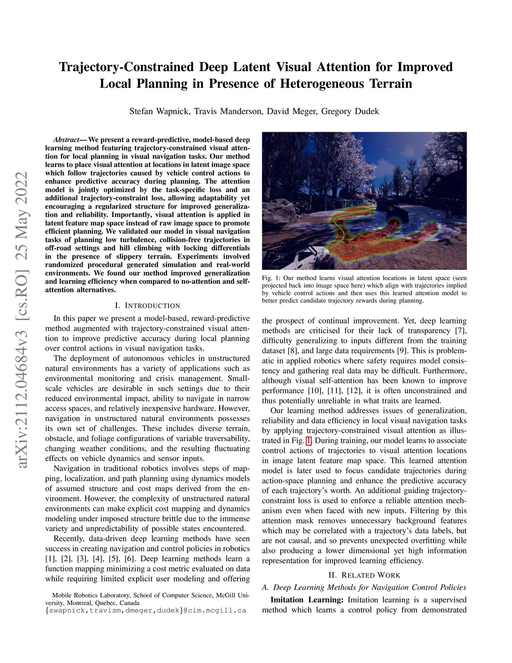 We present a reward-predictive, model-based deep learning method featuring trajectory-constrained visual attention for local planning in visual navigation tasks. Our method learns to place visual attention at locations in latent image space which follow trajectories caused by vehicle control actions to enhance predictive accuracy during planning. The attention model is jointly optimized by the task-specific loss and an additional trajectory-constraint loss, allowing adaptability yet encouraging a regularized structure for improved generalization and reliability. Importantly, visual attention is applied in latent feature map space instead of raw image space to promote efficient planning. We validated our model in visual navigation tasks of planning low turbulence, collision-free trajectories in off-road settings and hill climbing with locking differentials in the presence of slippery terrain. Experiments involved randomized procedural generated simulation and real-world environments. We found our method improved generalization and learning efficiency when compared to no-attention and self-attention alternatives.