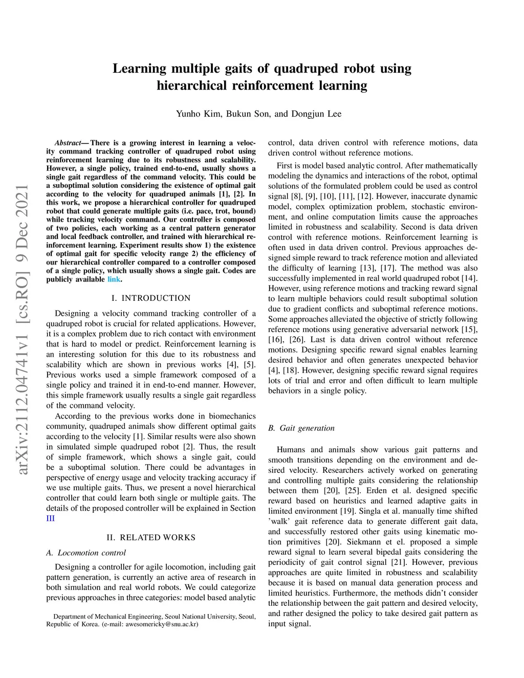 There is a growing interest in learning a velocity command tracking controller of quadruped robot using reinforcement learning due to its robustness and scalability. However, a single policy, trained end-to-end, usually shows a single gait regardless of the command velocity. This could be a suboptimal solution considering the existence of optimal gait according to the velocity for quadruped animals. In this work, we propose a hierarchical controller for quadruped robot that could generate multiple gaits (i.e. pace, trot, bound) while tracking velocity command. Our controller is composed of two policies, each working as a central pattern generator and local feedback controller, and trained with hierarchical reinforcement learning. Experiment results show 1) the existence of optimal gait for specific velocity range 2) the efficiency of our hierarchical controller compared to a controller composed of a single policy, which usually shows a single gait. Codes are publicly available.