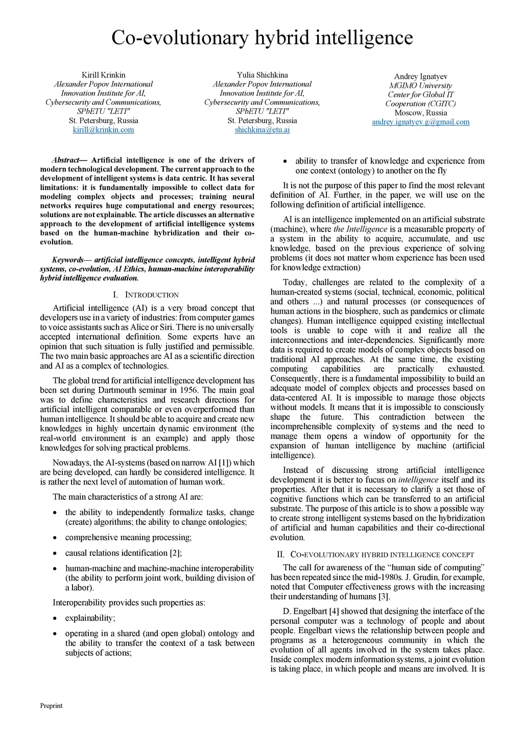 Artificial intelligence is one of the drivers of modern technological development. The current approach to the development of intelligent systems is data-centric. It has several limitations: it is fundamentally impossible to collect data for modeling complex objects and processes; training neural networks requires huge computational and energy resources; solutions are not explainable. The article discusses an alternative approach to the development of artificial intelligence systems based on human-machine hybridization and their co-evolution.
