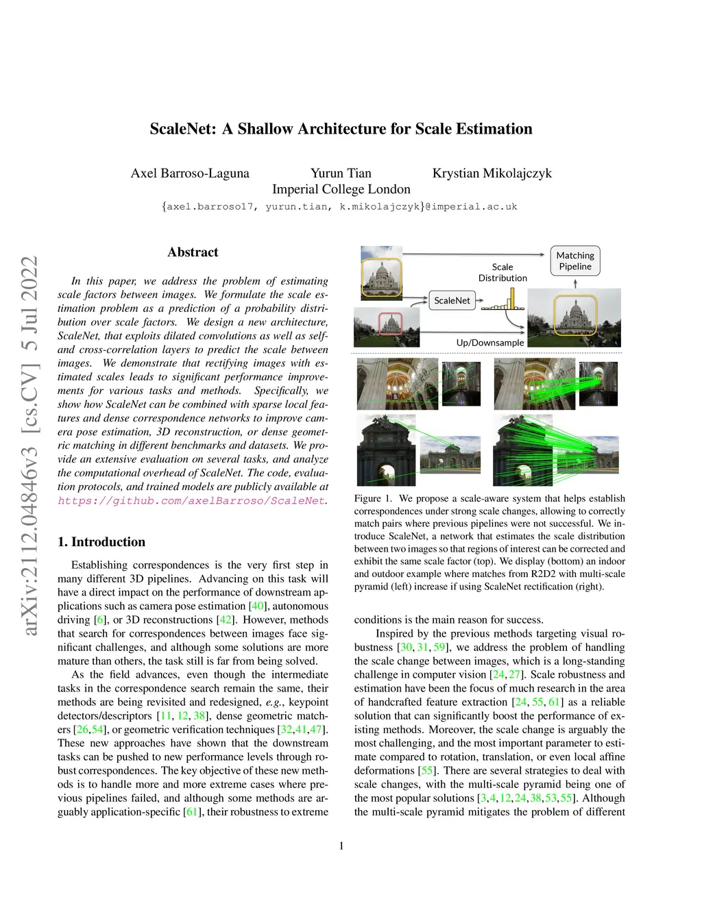 In this paper, we address the problem of estimating scale factors between images. We formulate the scale estimation problem as a prediction of a probability distribution over scale factors. We design a new architecture, ScaleNet, that exploits dilated convolutions as well as self and cross-correlation layers to predict the scale between images. We demonstrate that rectifying images with estimated scales leads to significant performance improvements for various tasks and methods. Specifically, we show how ScaleNet can be combined with sparse local features and dense correspondence networks to improve camera pose estimation, 3D reconstruction, or dense geometric matching in different benchmarks and datasets. We provide an extensive evaluation on several tasks and analyze the computational overhead of ScaleNet. The code, evaluation protocols, and trained models are publicly available at https://github.com/axelBarroso/ScaleNet.