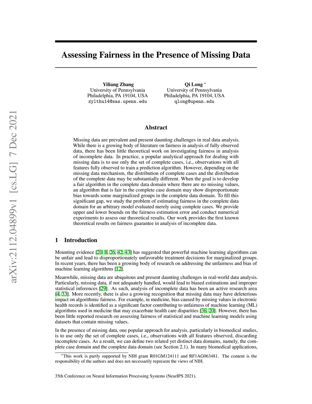 Missing data are prevalent and present daunting challenges in real data analysis. While there is a growing body of literature on fairness in analysis of fully observed data, there has been little theoretical work on investigating fairness in analysis of incomplete data. In practice, a popular analytical approach for dealing with missing data is to use only the set of complete cases, i.e., observations with all features fully observed to train a prediction algorithm. However, depending on the missing data mechanism, the distribution of complete cases and the distribution of the complete data may be substantially different. When the goal is to develop a fair algorithm in the complete data domain where there are no missing values, an algorithm that is fair in the complete case domain may show disproportionate bias towards some marginalized groups in the complete data domain. To fill this significant gap, we study the problem of estimating fairness in the complete data domain for an arbitrary model evaluated merely using complete cases. We provide upper and lower bounds on the fairness estimation error and conduct numerical experiments to assess our theoretical results. Our work provides the first known theoretical results on fairness guarantee in analysis of incomplete data.