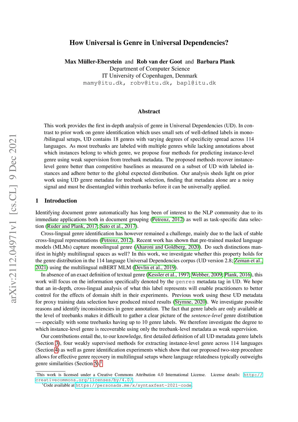 This work provides the first in-depth analysis of genre in Universal Dependencies (UD). In contrast to prior work on genre identification which uses small sets of well-defined labels in mono-/bilingual setups, UD contains 18 genres with varying degrees of specificity spread across 114 languages. As most treebanks are labeled with multiple genres while lacking annotations about which instances belong to which genre, we propose four methods for predicting instance-level genre using weak supervision from treebank metadata. The proposed methods recover instance-level genre better than competitive baselines as measured on a subset of UD with labeled instances and adhere better to the global expected distribution. Our analysis sheds light on prior work using UD genre metadata for treebank selection, finding that metadata alone are a noisy signal and must be disentangled within treebanks before it can be universally applied.