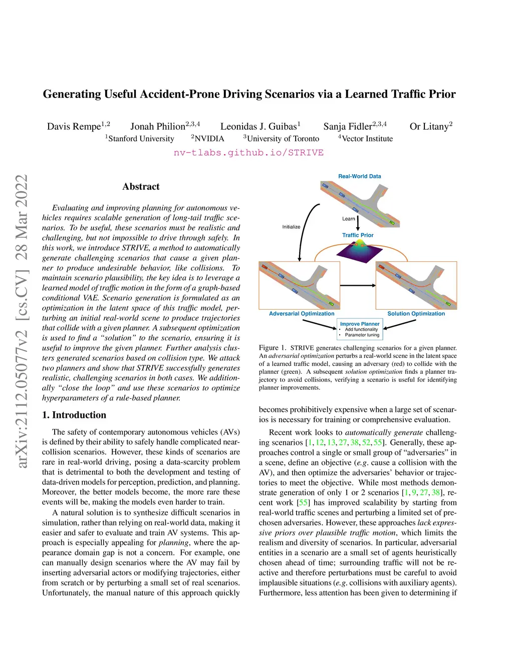 Evaluating and improving planning for autonomous vehicles requires scalable generation of long-tail traffic scenarios. To be useful, these scenarios must be realistic and challenging, but not impossible to drive through safely. In this work, we introduce STRIVE, a method to automatically generate challenging scenarios that cause a given planner to produce undesirable behavior, like collisions. To maintain scenario plausibility, the key idea is to leverage a learned model of traffic motion in the form of a graph-based conditional VAE. Scenario generation is formulated as an optimization in the latent space of this traffic model, perturbing an initial real-world scene to produce trajectories that collide with a given planner. A subsequent optimization is used to find a "solution" to the scenario, ensuring it is useful to improve the given planner. Further analysis clusters generated scenarios based on collision type. We attack two planners and show that STRIVE successfully generates realistic, challenging scenarios in both cases. We additionally "close the loop" and use these scenarios to optimize hyperparameters of a rule-based planner.