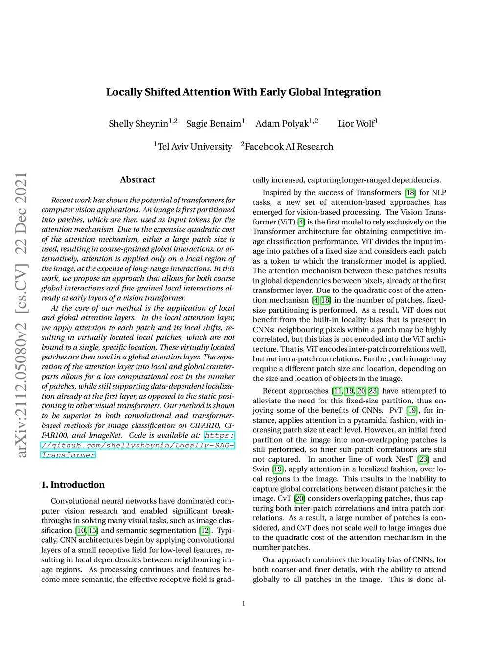 Recent work has shown the potential of transformers for computer vision applications. An image is first partitioned into patches, which are then used as input tokens for the attention mechanism. Due to the expensive quadratic cost of the attention mechanism, either a large patch size is used, resulting in coarse-grained global interactions, or alternatively, attention is applied only on a local region of the image, at the expense of long-range interactions. In this work, we propose an approach that allows for both coarse global interactions and fine-grained local interactions already at early layers of a vision transformer. At the core of our method is the application of local and global attention layers. In the local attention layer, we apply attention to each patch and its local shifts, resulting in virtually located local patches, which are not bound to a single, specific location. These virtually located patches are then used in a global attention layer. The separation of the attention layer into local and global counterparts allows for a low computational cost in the number of patches, while still supporting data-dependent localization already at the first layer, as opposed to the static positioning in other visual transformers. Our method is shown to be superior to both convolutional and transformer-based methods for image classification on CIFAR10, CIFAR100, and ImageNet. Code is available at: https://github.com/shellysheynin/Locally-SAG-Transformer.