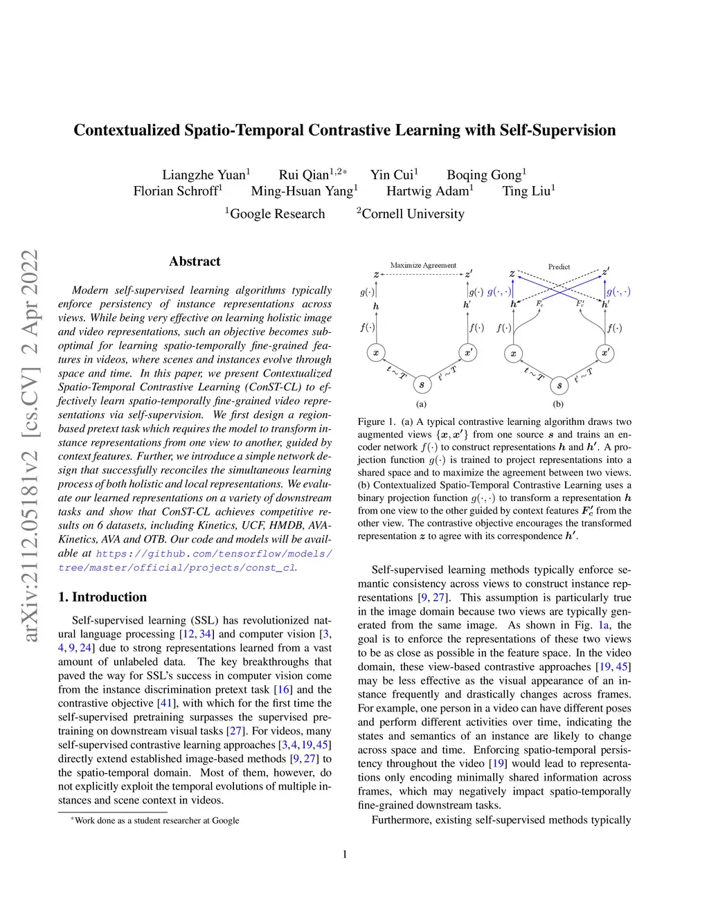 Modern self-supervised learning algorithms typically enforce persistency of instance representations across views. While being very effective on learning holistic image and video representations, such an objective becomes sub-optimal for learning spatio-temporally fine-grained features in videos, where scenes and instances evolve through space and time. In this paper, we present Contextualized Spatio-Temporal Contrastive Learning (ConST-CL) to effectively learn spatio-temporally fine-grained video representations via self-supervision. We first design a region-based pretext task which requires the model to transform in-stance representations from one view to another, guided by context features. Further, we introduce a simple network design that successfully reconciles the simultaneous learning process of both holistic and local representations. We evaluate our learned representations on a variety of downstream tasks and show that ConST-CL achieves competitive results on 6 datasets, including Kinetics, UCF, HMDB, AVA-Kinetics, AVA and OTB.