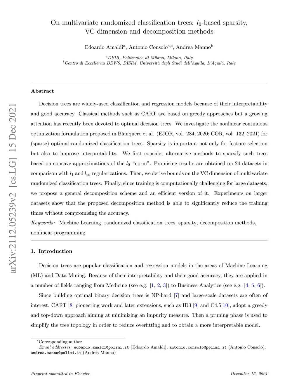 Decision trees are widely-used classification and regression models because of their interpretability and good accuracy. Classical methods such as CART are based on greedy approaches but a growing attention has recently been devoted to optimal decision trees. We investigate the nonlinear continuous optimization formulation proposed in Blanquero et al. (EJOR, vol. 284, 2020; COR, vol. 132, 2021) for (sparse) optimal randomized classification trees. Sparsity is important not only for feature selection but also to improve interpretability. We first consider alternative methods to sparsify such trees based on concave approximations of the ``norm". Promising results are obtained on 24 datasets in comparison with and regularizations. Then, we derive bounds on the VC dimension of multivariate randomized classification trees. Finally, since training is computationally challenging for large datasets, we propose a general decomposition scheme and an efficient version of it. Experiments on larger datasets show that the proposed decomposition method is able to significantly reduce the training times without compromising the accuracy.