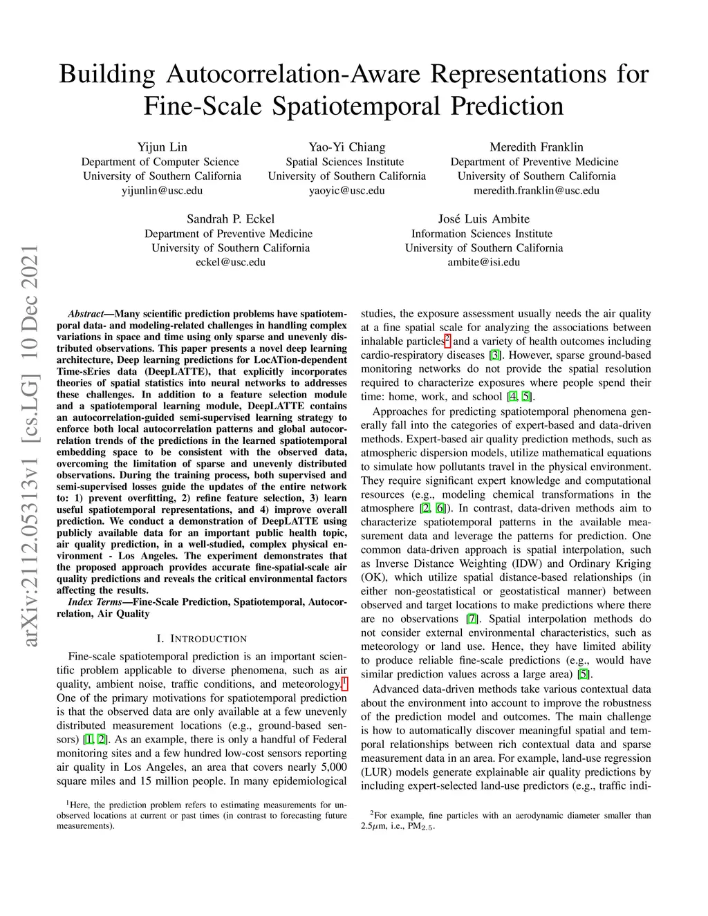 Many scientific prediction problems have spatiotemporal data- and modeling-related challenges in handling complex variations in space and time using only sparse and unevenly distributed observations. This paper presents a novel deep learning architecture, Deep learning predictions for LocATion-dependent Time-sEries data (DeepLATTE), that explicitly incorporates theories of spatial statistics into neural networks to address these challenges. In addition to a feature selection module and a spatiotemporal learning module, DeepLATTE contains an autocorrelation-guided semi-supervised learning strategy to enforce both local autocorrelation patterns and global autocorrelation trends of the predictions in the learned spatiotemporal embedding space to be consistent with the observed data, overcoming the limitation of sparse and unevenly distributed observations. During the training process, both supervised and semi-supervised losses guide the updates of the entire network to: 1) prevent overfitting, 2) refine feature selection, 3) learn useful spatiotemporal representations, and 4) improve overall prediction. We conduct a demonstration of DeepLATTE using publicly available data for an important public health topic, air quality prediction, in a well-studied, complex physical environment - Los Angeles. The experiment demonstrates that the proposed approach provides accurate fine-spatial-scale air quality predictions and reveals the critical environmental factors affecting the results.