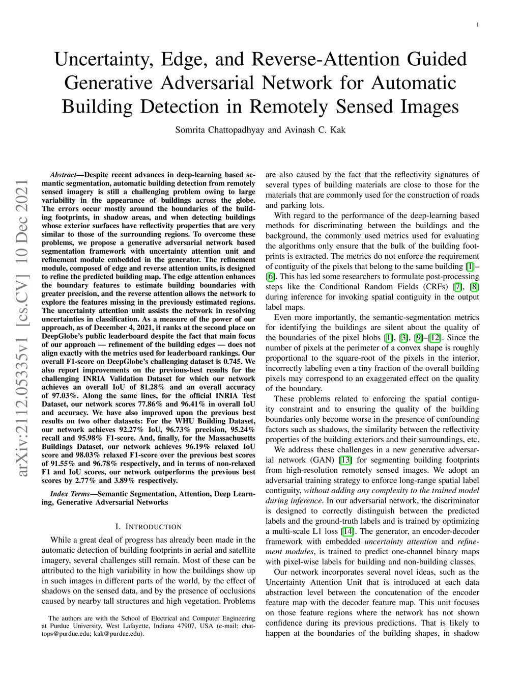 Despite recent advances in deep-learning based semantic segmentation, automatic building detection from remotely sensed imagery is still a challenging problem owing to large variability in the appearance of buildings across the globe. The errors occur mostly around the boundaries of the building footprints, in shadow areas, and when detecting buildings whose exterior surfaces have reflectivity properties that are very similar to those of the surrounding regions. To overcome these problems, we propose a generative adversarial network based segmentation framework with uncertainty attention unit and refinement module embedded in the generator. The refinement module, composed of edge and reverse attention units, is designed to refine the predicted building map. The edge attention enhances the boundary features to estimate building boundaries with greater precision, and the reverse attention allows the network to explore the features missing in the previously estimated regions. The uncertainty attention unit assists the network in resolving uncertainties in classification. As a measure of the power of our approach, as of December 4, 2021, it ranks at the second place on DeepGlobe's public leaderboard despite the fact that main focus of our approach -- refinement of the building edges -- does not align exactly with the metrics used for leaderboard rankings. Our overall F1-score on DeepGlobe's challenging dataset is 0.745. We also report improvements on the previous-best results for the challenging INRIA Validation Dataset for which our network achieves an overall IoU of 81.28% and an overall accuracy of 97.03%. Along the same lines, for the official INRIA Test Dataset, our network scores 77.86% and 96.41% in overall IoU and accuracy.