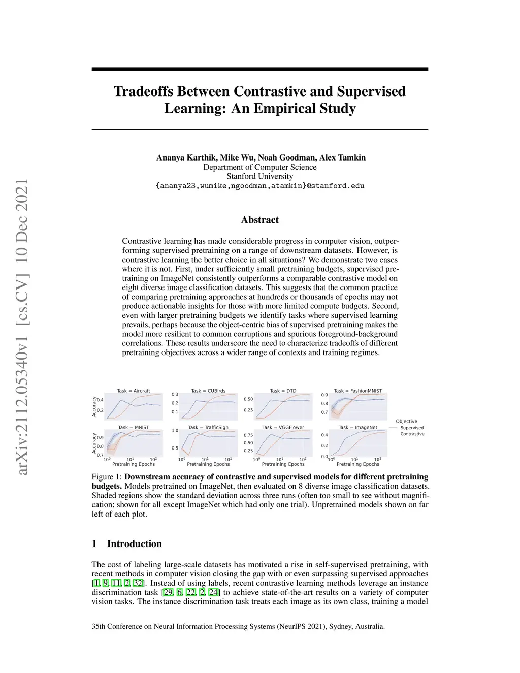 Contrastive learning has made considerable progress in computer vision, outperforming supervised pretraining on a range of downstream datasets. However, is contrastive learning the better choice in all situations? We demonstrate two cases where it is not. First, under sufficiently small pretraining budgets, supervised pretraining on ImageNet consistently outperforms a comparable contrastive model on eight diverse image classification datasets. This suggests that the common practice of comparing pretraining approaches at hundreds or thousands of epochs may not produce actionable insights for those with more limited compute budgets. Second, even with larger pretraining budgets we identify tasks where supervised learning prevails, perhaps because the object-centric bias of supervised pretraining makes the model more resilient to common corruptions and spurious foreground-background correlations. These results underscore the need to characterize tradeoffs of different pretraining objectives across a wider range of contexts and training regimes.
