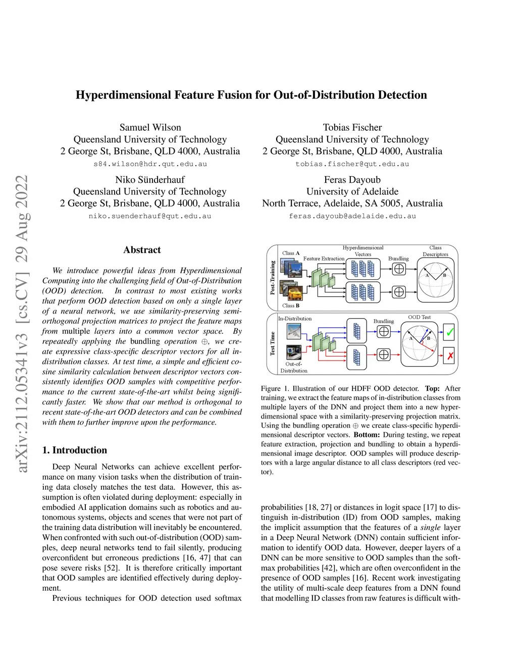 We introduce powerful ideas from Hyperdimensional Computing into the challenging field of Out-of-Distribution (OOD) detection. In contrast to most existing work that performs OOD detection based on only a single layer of a neural network, we use similarity-preserving semi-orthogonal projection matrices to project the feature maps from multiple layers into a common vector space. By repeatedly applying the bundling operation , we create expressive class-specific descriptor vectors for all in-distribution classes. At test time, a simple and efficient cosine similarity calculation between descriptor vectors consistently identifies OOD samples with better performance than the current state-of-the-art. We show that the hyperdimensional fusion of multiple network layers is critical to achieve best general performance.