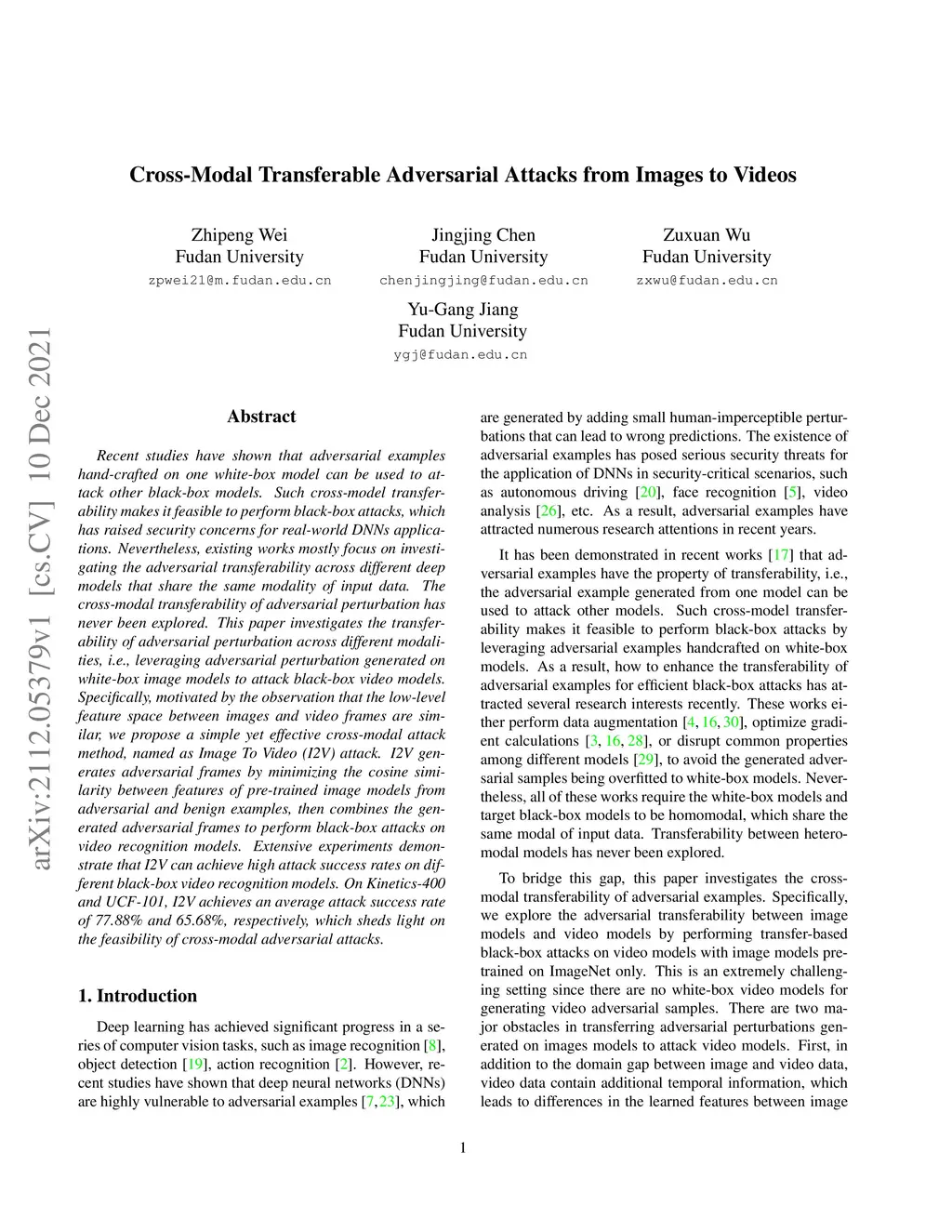 Recent studies have shown that adversarial examples hand-crafted on one white-box model can be used to attack other black-box models. Such cross-model transferability makes it feasible to perform black-box attacks, which has raised security concerns for real-world DNNs applications. Nevertheless, existing works mostly focus on investigating the adversarial transferability across different deep models that share the same modality of input data. The cross-modal transferability of adversarial perturbation has never been explored. This paper investigates the transferability of adversarial perturbation across different modalities, i.e., leveraging adversarial perturbation generated on white-box image models to attack black-box video models. Specifically, motivated by the observation that the low-level feature space between images and video frames are similar, we propose a simple yet effective cross-modal attack method, named as Image To Video (I2V) attack. I2V generates adversarial frames by minimizing the cosine similarity between features of pre-trained image models from adversarial and benign examples, then combines the generated adversarial frames to perform black-box attacks on video recognition models. Extensive experiments demonstrate that I2V can achieve high attack success rates on different black-box video recognition models. On Kinetics-400 and UCF-101, I2V achieves an average attack success rate of 77.88% and 65.68%, respectively, which sheds light on the feasibility of cross-modal adversarial attacks.