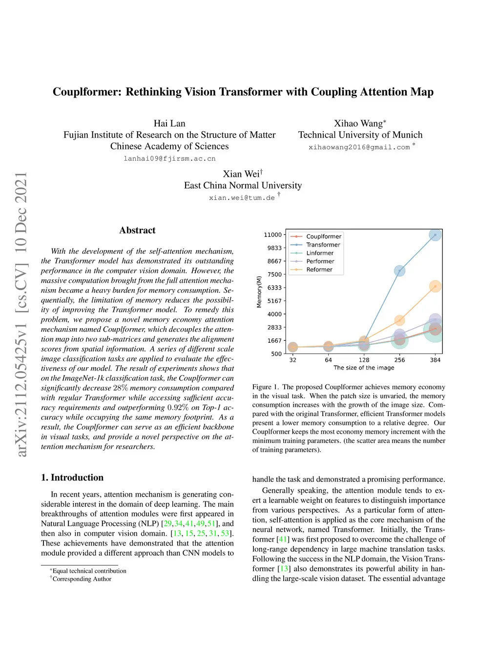 With the development of the self-attention mechanism, the Transformer model has demonstrated its outstanding performance in the computer vision domain. However, the massive computation brought from the full attention mechanism became a heavy burden for memory consumption. Sequentially, the limitation of memory reduces the possibility of improving the Transformer model. To remedy this problem, we propose a novel memory economy attention mechanism named Couplformer, which decouples the attention map into two sub-matrices and generates the alignment scores from spatial information. A series of different scale image classification tasks are applied to evaluate the effectiveness of our model. The result of experiments shows that on the ImageNet-1k classification task, the Couplformer can significantly decrease 28% memory consumption compared with regular Transformer while accessing sufficient accuracy requirements and outperforming 0.92% on Top-1 accuracy while occupying the same memory footprint. As a result, the Couplformer can serve as an efficient backbone in visual tasks, and provide a novel perspective on the attention mechanism for researchers.