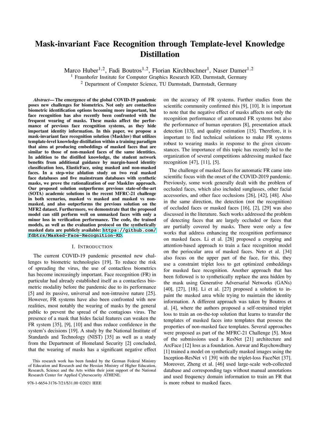 The emergence of the global COVID-19 pandemic poses new challenges for biometrics. Not only are contactless biometric identification options becoming more important, but face recognition has also recently been confronted with the frequent wearing of masks. These masks affect the performance of previous face recognition systems, as they hide important identity information. In this paper, we propose a mask-invariant face recognition solution (MaskInv) that utilizes template-level knowledge distillation within a training paradigm that aims at producing embeddings of masked faces that are similar to those of non-masked faces of the same identities. In addition to the distilled knowledge, the student network benefits from additional guidance by margin-based identity classification loss, ElasticFace, using masked and non-masked faces. In a step-wise ablation study on two real masked face databases and five mainstream databases with synthetic masks, we prove the rationalization of our MaskInv approach. Our proposed solution outperforms previous state-of-the-art (SOTA) academic solutions in the recent MFRC-21 challenge in both scenarios, masked vs masked and masked vs non-masked, and also outperforms the previous solution on the MFR2 dataset. Furthermore, we demonstrate that the proposed model can still perform well on unmasked faces with only a minor loss in verification performance. The code, the trained models, as well as the evaluation protocol on the synthetically masked data are publicly available: https://github.com/fdbtrs/Masked-Face-Recognition-KD.