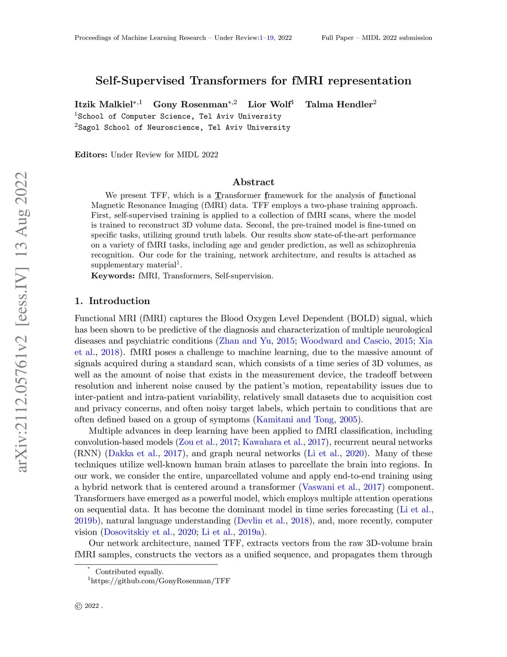 We present TFF, which is a Transformer framework for the analysis of functional Magnetic Resonance Imaging (fMRI) data. TFF employs a two-phase training approach. First, self-supervised training is applied to a collection of fMRI scans, where the model is trained to reconstruct 3D volume data. Second, the pre-trained model is fine-tuned on specific tasks, utilizing ground truth labels. Our results show state-of-the-art performance on a variety of fMRI tasks, including age and gender prediction, as well as schizophrenia recognition. Our code for the training, network architecture, and results is attached as supplementary material.