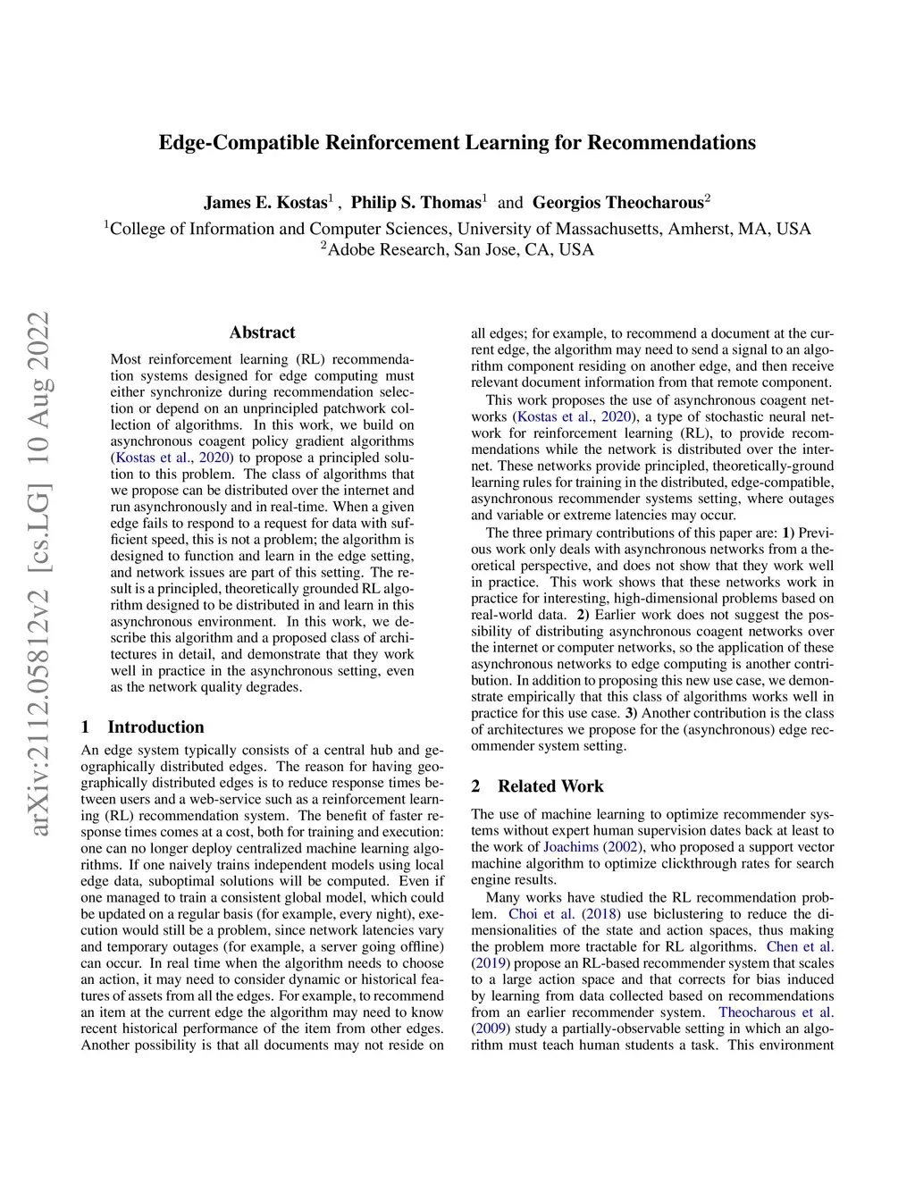 Most reinforcement learning (RL) recommendation systems designed for edge computing must either synchronize during recommendation selection or depend on an unprincipled patchwork collection of algorithms. In this work, we build on asynchronous coagent policy gradient algorithms \citep{kostas2020asynchronous} to propose a principled solution to this problem. The class of algorithms that we propose can be distributed over the internet and run asynchronously and in real-time. When a given edge fails to respond to a request for data with sufficient speed, this is not a problem; the algorithm is designed to function and learn in the edge setting, and network issues are part of this setting. The result is a principled, theoretically grounded RL algorithm designed to be distributed in and learn in this asynchronous environment. In this work, we describe this algorithm and a proposed class of architectures in detail, and demonstrate that they work well in practice in the asynchronous setting, even as the network quality degrades.