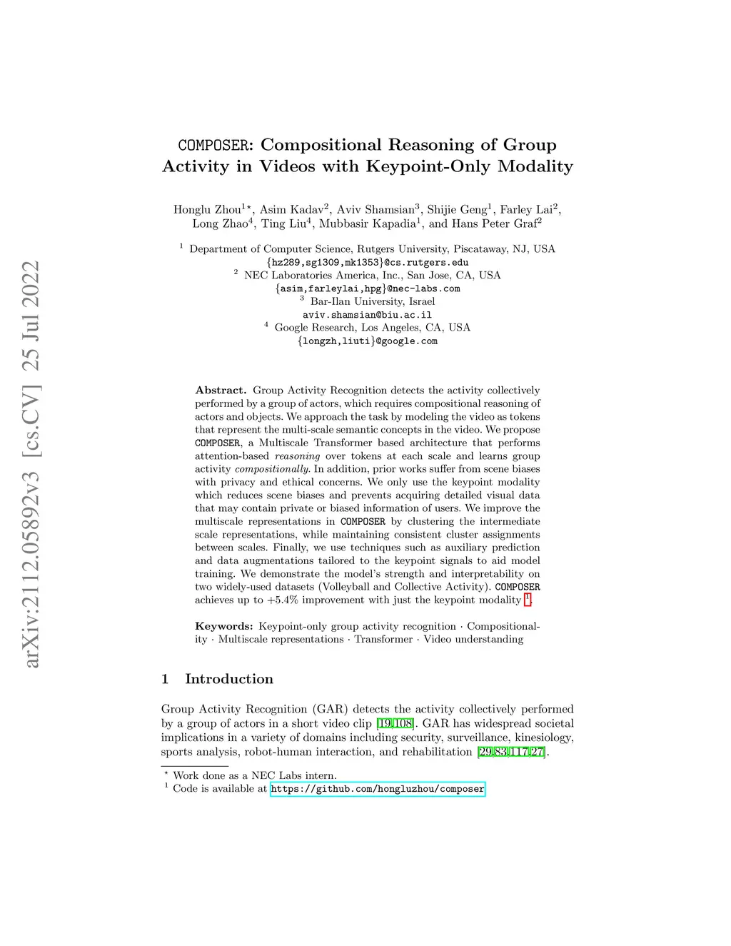 Group Activity Recognition detects the activity collectively performed by a group of actors, which requires compositional reasoning of actors and objects. We approach the task by modeling the video as tokens that represent the multi-scale semantic concepts in the video. We propose COMPOSER, a Multiscale Transformer based architecture that performs attention-based reasoning over tokens at each scale and learns group activity compositionally. In addition, prior works suffer from scene biases with privacy and ethical concerns. We only use the keypoint modality which reduces scene biases and prevents acquiring detailed visual data that may contain private or biased information of users. We improve the multiscale representations in COMPOSER by clustering the intermediate scale representations, while maintaining consistent cluster assignments between scales. Finally, we use techniques such as auxiliary prediction and data augmentations tailored to the keypoint signals to aid model training. We demonstrate the model's strength and interpretability on two widely-used datasets (Volleyball and Collective Activity). COMPOSER achieves up to +5.4% improvement with just the keypoint modality. Code is available at https://github.com/hongluzhou/composer