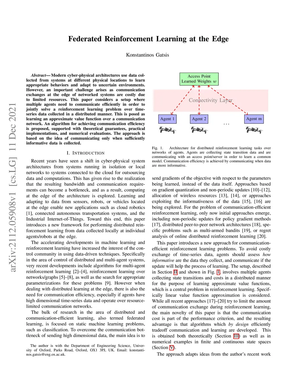 Modern cyber-physical architectures use data collected from systems at different physical locations to learn appropriate behaviors and adapt to uncertain environments. However, an important challenge arises as communication exchanges at the edge of networked systems are costly due to limited resources. This paper considers a setup where multiple agents need to communicate efficiently in order to jointly solve a reinforcement learning problem over time-series data collected in a distributed manner. This is posed as learning an approximate value function over a communication network. An algorithm for achieving communication efficiency is proposed, supported with theoretical guarantees, practical implementations, and numerical evaluations. The approach is based on the idea of communicating only when sufficiently informative data is collected.