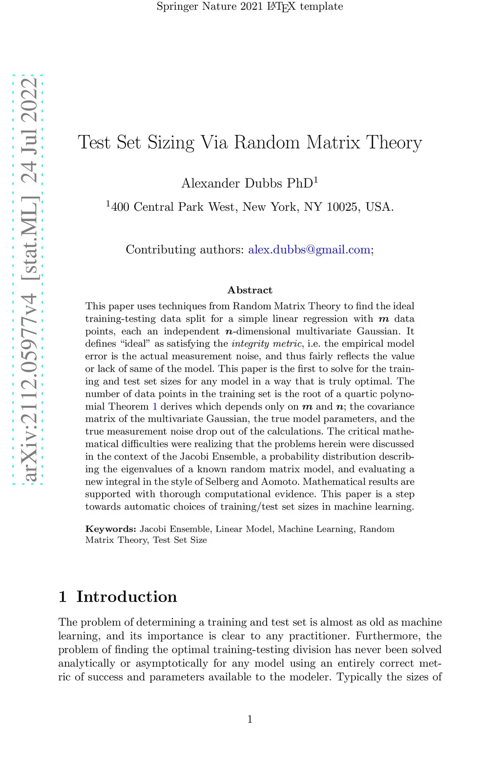 This paper uses techniques from Random Matrix Theory to find the ideal training-testing data split for a simple linear regression with m data points, each an independent n-dimensional multivariate Gaussian. It defines "ideal" as satisfying the integrity metric, i.e. the empirical model error is the actual measurement noise, and thus fairly reflects the value or lack of same of the model. This paper is the first to solve for the training and test size for any model in a way that is truly optimal. The number of data points in the training set is the root of a quartic polynomial Theorem 1 derives which depends only on m and n; the covariance matrix of the multivariate Gaussian, the true model parameters, and the true measurement noise drop out of the calculations. The critical mathematical difficulties were realizing that the problems herein were discussed in the context of the Jacobi Ensemble, a probability distribution describing the eigenvalues of a known random matrix model, and evaluating a new integral in the style of Selberg and Aomoto. Mathematical results are supported with thorough computational evidence. This paper is a step towards automatic choices of training/test set sizes in machine learning.