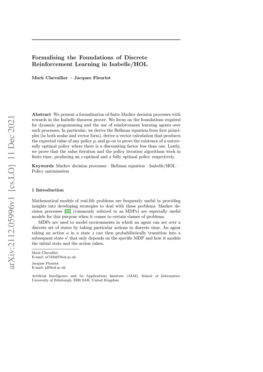 We present a formalisation of finite Markov decision processes with rewards in the Isabelle theorem prover. We focus on the foundations required for dynamic programming and the use of reinforcement learning agents over such processes. In particular, we derive the Bellman equation from first principles (in both scalar and vector form), derive a vector calculation that produces the expected value of any policy p, and go on to prove the existence of a universally optimal policy where there is a discounting factor less than one. Lastly, we prove that the value iteration and the policy iteration algorithms work in finite time, producing an epsilon-optimal and a fully optimal policy respectively.