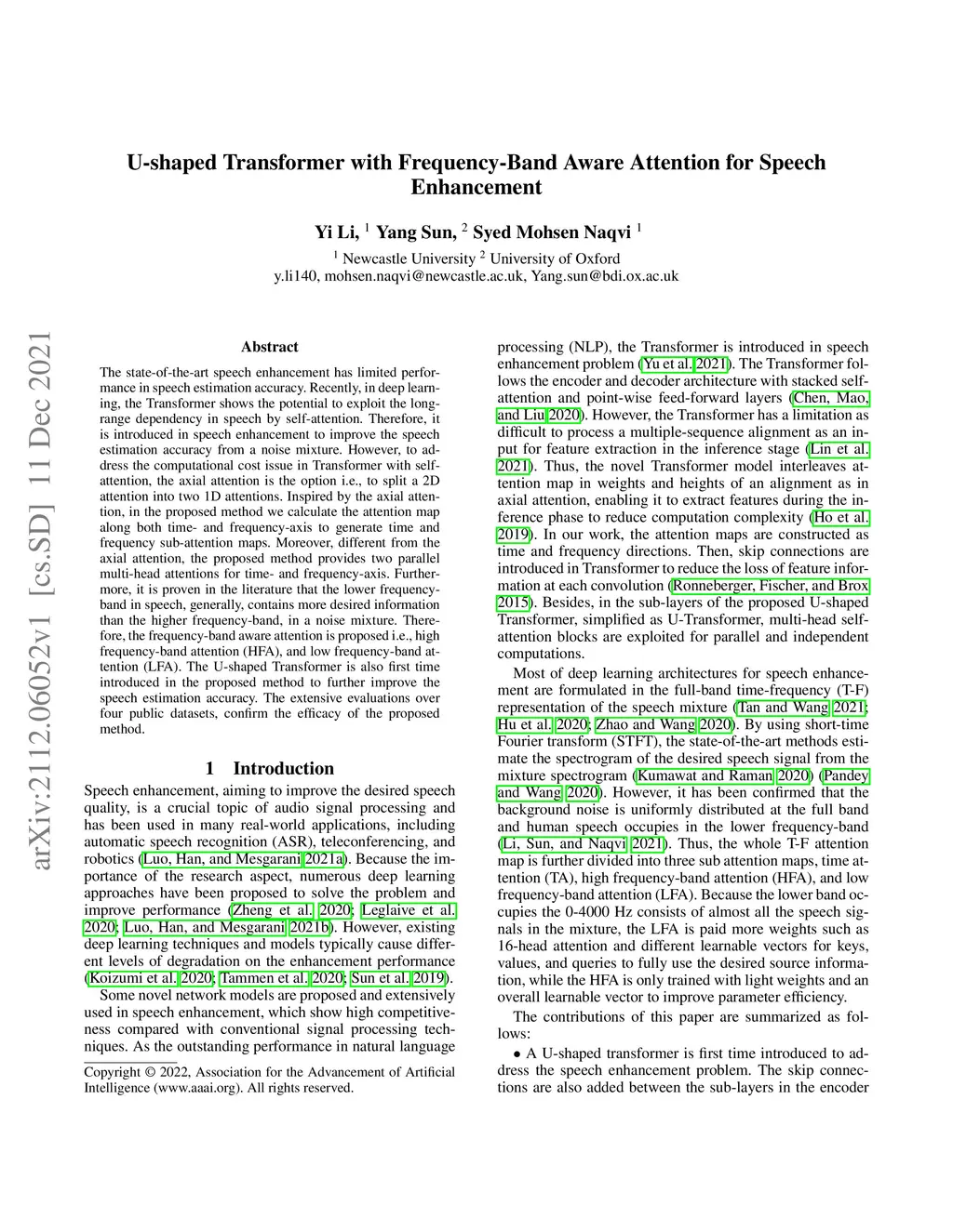 The state-of-the-art speech enhancement has limited performance in speech estimation accuracy. Recently, in deep learning, the Transformer shows the potential to exploit the long-range dependency in speech by self-attention. Therefore, it is introduced in speech enhancement to improve the speech estimation accuracy from a noise mixture. However, to address the computational cost issue in Transformer with self-attention, the axial attention is the option i.e., to split a 2D attention into two 1D attentions. Inspired by the axial attention, in the proposed method we calculate the attention map along both time- and frequency-axis to generate time and frequency sub-attention maps. Moreover, different from the axial attention, the proposed method provides two parallel multi-head attentions for time- and frequency-axis. Furthermore, it is proven in the literature that the lower frequency-band in speech, generally, contains more desired information than the higher frequency-band, in a noise mixture. Therefore, the frequency-band aware attention is proposed i.e., high frequency-band attention (HFA), and low frequency-band attention (LFA). The U-shaped Transformer is also first time introduced in the proposed method to further improve the speech estimation accuracy. The extensive evaluations over four public datasets, confirm the efficacy of the proposed method.