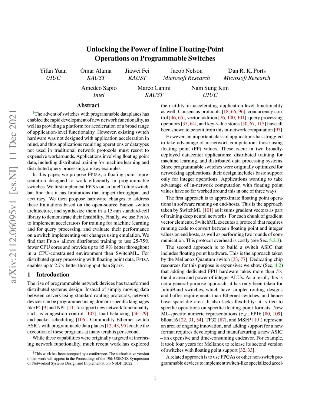 The advent of switches with programmable dataplanes has enabled the rapid development of new network functionality, as well as providing a platform for acceleration of a broad range of application-level functionality. However, existing switch hardware was not designed with application acceleration in mind, and thus applications requiring operations or datatypes not used in traditional network protocols must resort to expensive workarounds. Applications involving floating point data, including distributed training for machine learning and distributed query processing, are key examples. In this paper, we propose FPISA, a floating point representation designed to work efficiently in programmable switches. We first implement FPISA on an Intel Tofino switch, but find that it has limitations that impact throughput and accuracy. We then propose hardware changes to address these limitations based on the open-source Banzai switch architecture, and synthesize them in a 15-nm standard-cell library to demonstrate their feasibility. Finally, we use FPISA to implement accelerators for training for machine learning and for query processing, and evaluate their performance on a switch implementing our changes using emulation. We find that FPISA allows distributed training to use 25-75% fewer CPU cores and provide up to 85.9% better throughput in a CPU-constrained environment than SwitchML. For distributed query processing with floating point data, FPISA enables up to 2.7x better throughput than Spark.