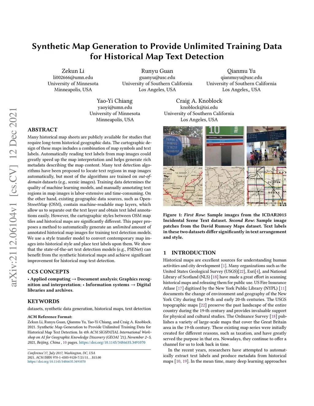 Many historical map sheets are publicly available for studies that require long-term historical geographic data. The cartographic design of these maps includes a combination of map symbols and text labels. Automatically reading text labels from map images could greatly speed up the map interpretation and helps generate rich metadata describing the map content. Many text detection algorithms have been proposed to locate text regions in map images automatically, but most of the algorithms are trained on out-ofdomain datasets (e.g., scenic images). Training data determines the quality of machine learning models, and manually annotating text regions in map images is labor-extensive and time-consuming. On the other hand, existing geographic data sources, such as Open- StreetMap (OSM), contain machine-readable map layers, which allow us to separate out the text layer and obtain text label annotations easily. However, the cartographic styles between OSM map tiles and historical maps are significantly different. This paper proposes a method to automatically generate an unlimited amount of annotated historical map images for training text detection models. We use a style transfer model to convert contemporary map images into historical style and place text labels upon them. We show that the state-of-the-art text detection models (e.g., PSENet) can benefit from the synthetic historical maps and achieve significant improvement for historical map text detection.