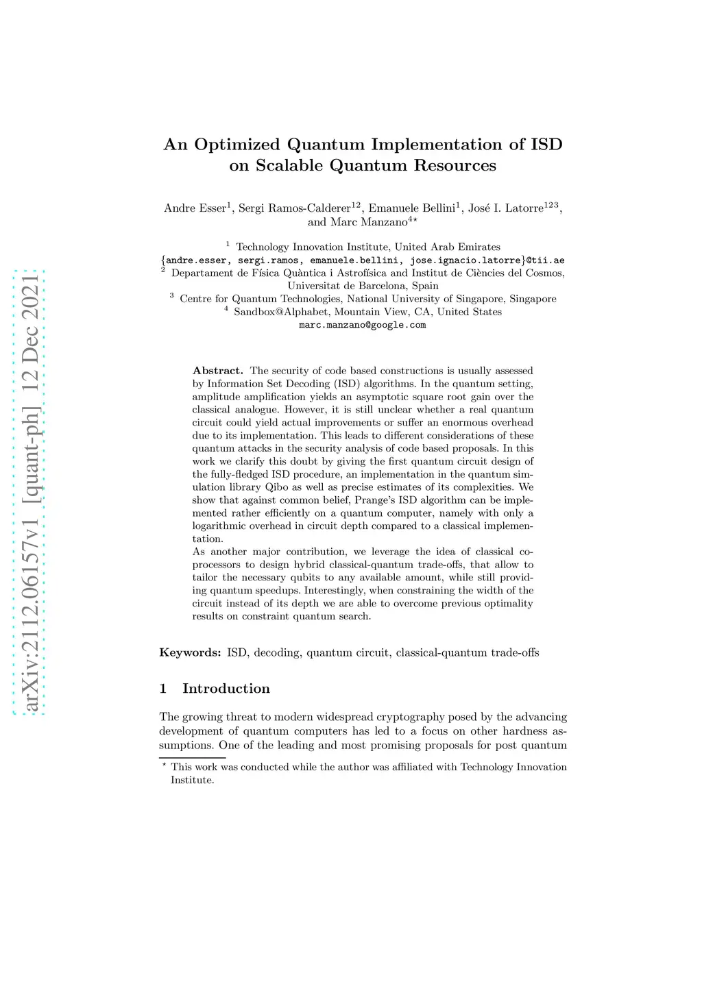 An Optimized Quantum Implementation of ISD on Scalable Quantum Resources