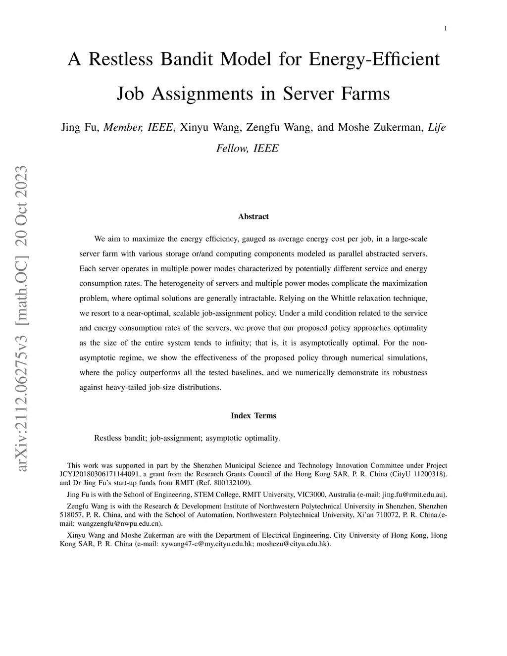A Restless Bandit Model for Energy-Efficient Job Assignments in Server